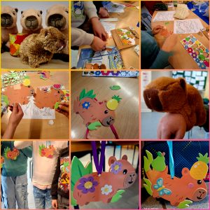 „Wie, du weißt nicht, was Capybaras sind?“, war eine häufig gehörte Frage in den vergangenen Wochen. „Capybara, Capybara…“ Nein, es öffnete sich keine Schublade, in der der Begriff jemals gefallen sein könnte. Um es vorwegzunehmen, Capybaras sind Wasserschweine und somit eine Säugetierart aus der Familie der Meerschweinchen. Sie sind die größten heute lebenden Nagetiere, putzig anzuschauen und meist im Wasser zuhause. Autor Matthäus Bär widmete ihnen gemeinsam mit Illustratorin Anika Voigt ein Buch mit dem vielversprechenden Titel „Drei Wasserschweine brennen durch“. „Wohin denn?“, fragt man sich da unvermittelt und schließt die nächste Überlegung an: „Wer sind diese Wasserschweine?“ Nun, sie heißen Emmy, Raul und Tristan, leben mit ihrer Herde auf einer Wiese im Zoo und könnten rundum zufrieden sein. Doch Raul ist auf der Suche nach dem „Mehr“. „,Das kann doch nicht alles sein‘, schnaubte Raul. ,Es muss einfach mehr geben.‘ Zornig stampfte er auf den hart getrampelten Boden. ;Im Schlamm liegen, aufs Futter warten, fressen, ausruhen, baden, (…), schlafen, übrig gebliebenes Futter suchen, ein wenig faulenzen, noch einmal fressen und wieder schlafen. Das kann es doch nicht gewesen sein.‘ Die anderen Wasserschweine sahen ihn verständnislos an.“ Mit diesen Worten setzte das forsche Capybara etwas in Bewegung, wovon niemand je geträumt hätte, auch nicht die Schüler der 3b und ihrer Klassenleiterin Sonja Hexel. Gemeinsam erobern sich die Tiere jeden Tag ein wenig mehr vom „Mehr“, von Freiheit und Selbstbestimmung. Die zum Vorlesen mitgebrachten Capybara-Kuscheltiere, das niedliche Schnapp-Capy fürs Handgelenk und die passenden Sticker und Bastelmaterialien begeisterten die Mädchen und Jungen sofort und schnell war man bei der Arbeit. Wie konnte man das Wasserschwein noch ein bisschen hübscher werden lassen? Wohin gehört das Gras? Kann man den Apfel auch auf den Rücken kleben?