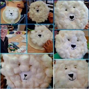 Hans de Beers liebevoll geschriebenes und illustriertes Bilderbuch „Kleiner Eisbär. Wohin fährst du, Lars?“ ist eines von denen, die man am liebsten gar nicht mehr aus der Hand legen mag. Gemeinsam mit den Kindern der 2b und Klassenlehrerin Andrea Becker darin zu blättern, die Sorgen, Nöte und auch Freuden des kleinen Eisbärkindes Lars auf sich wirken zu lassen und abschließend das Gehörte auch gestalterisch zu erarbeiten, ist ein großes Anliegen der Lesepatin Claudia Römer. Wie schön ist es, dabei an einem runden Tisch zu sitzen, sich anschauen zu können und auf Fragen und Zwischenkommentare direkt reagieren zu dürfen! Es ist eben nicht alltäglich, dass ein Eisbärjunge über Nacht von seinem Vater und seiner kalten Heimat am Nordpol getrennt wird und plötzlich und unvorbereitet in einem warmen und grünen Land aufwacht. Doch in Hippo, dem Flusspferd, Drago, dem Adler, und Orka, dem Wal, findet Lars ganz schnell gute Freunde, die ihm helfend unter die Pfoten greifen. Und dann ist er recht schnell wieder da, wo er am liebsten ist, bei seinem Papa, den Lars schmerzlich vermisst hat. Zu erzählen hat er viel, von Geschehnissen, Tieren und Landschaften, von denen er nicht wusste, dass es sie gab. Das Basteln von einzigartigen Eisbären aus Papptellern und Wattebäuschen bereitete allen Kindern große Freude. Mit Feuereifer waren die Mädchen und Jungen, sogar der sie begleitende Praktikant Leonard, bei der Sache und am Ende bewunderten sie ihre fertigen Tiere, die allesamt ihre ganz eigene Persönlichkeit entfalten durften.